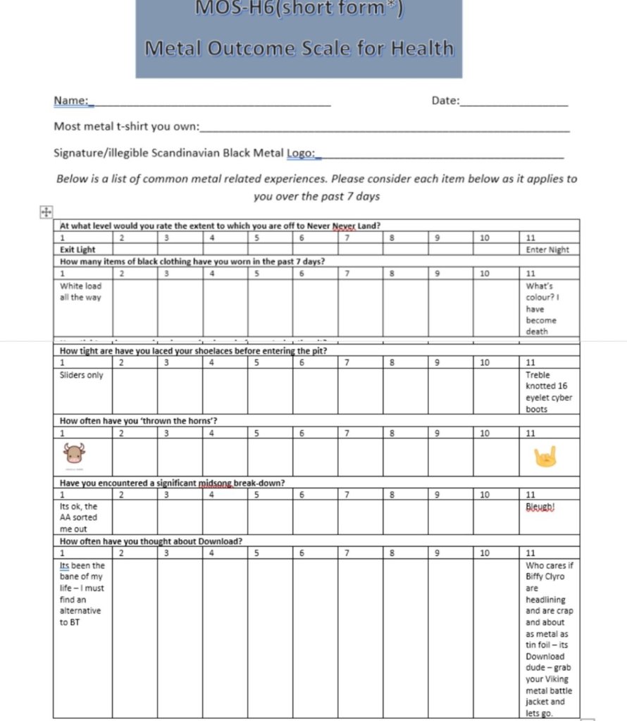 Ā·        Hair length between 30 and 40 cms (to confirm metalhead status)