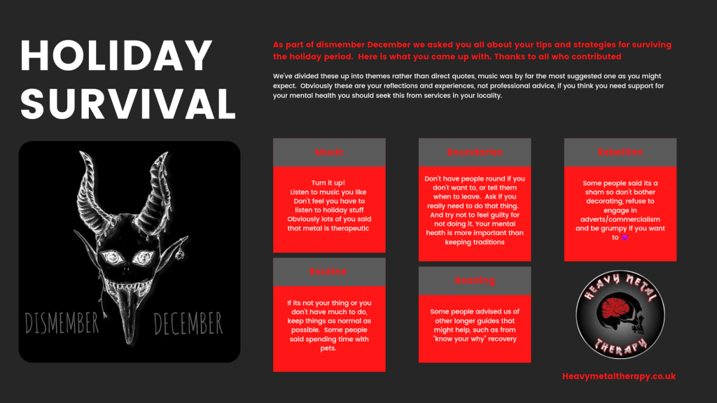 We asked you over on social media to share with us your tips for surviving the holiday period, as part of our Dismember December stuff this month. We put your contributions into themes and summarised them here