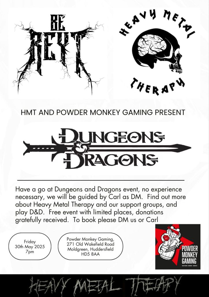 Come and join us on 30th May for a “have a go” at Dungeons and Dragons session which will be part game, and also opportunity to find out more about HMT and our support groups. At Powder Monkey Gaming in Huddersfield. Contact us to book