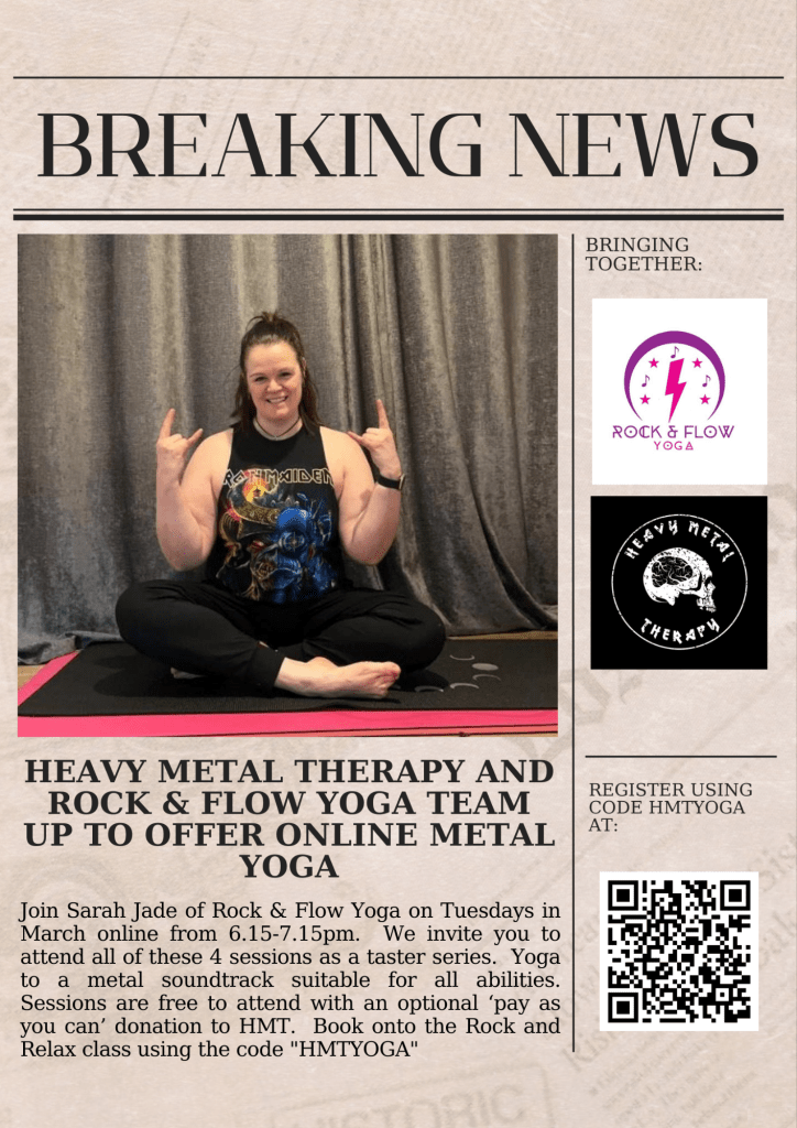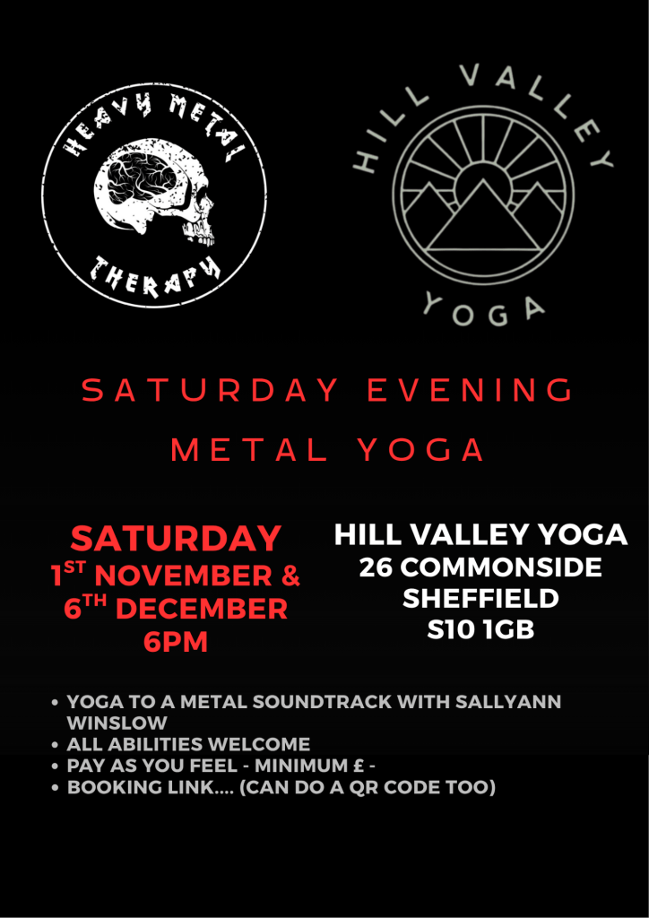 * Metal yoga classes in association with HMT are offered at a reduced, low or no cost for the wellbeing benefit of metal fans. The running of classes including insurance/liability remains with the instructor. Some of the money collected from classes or part of related fundraising may be donated to HMT