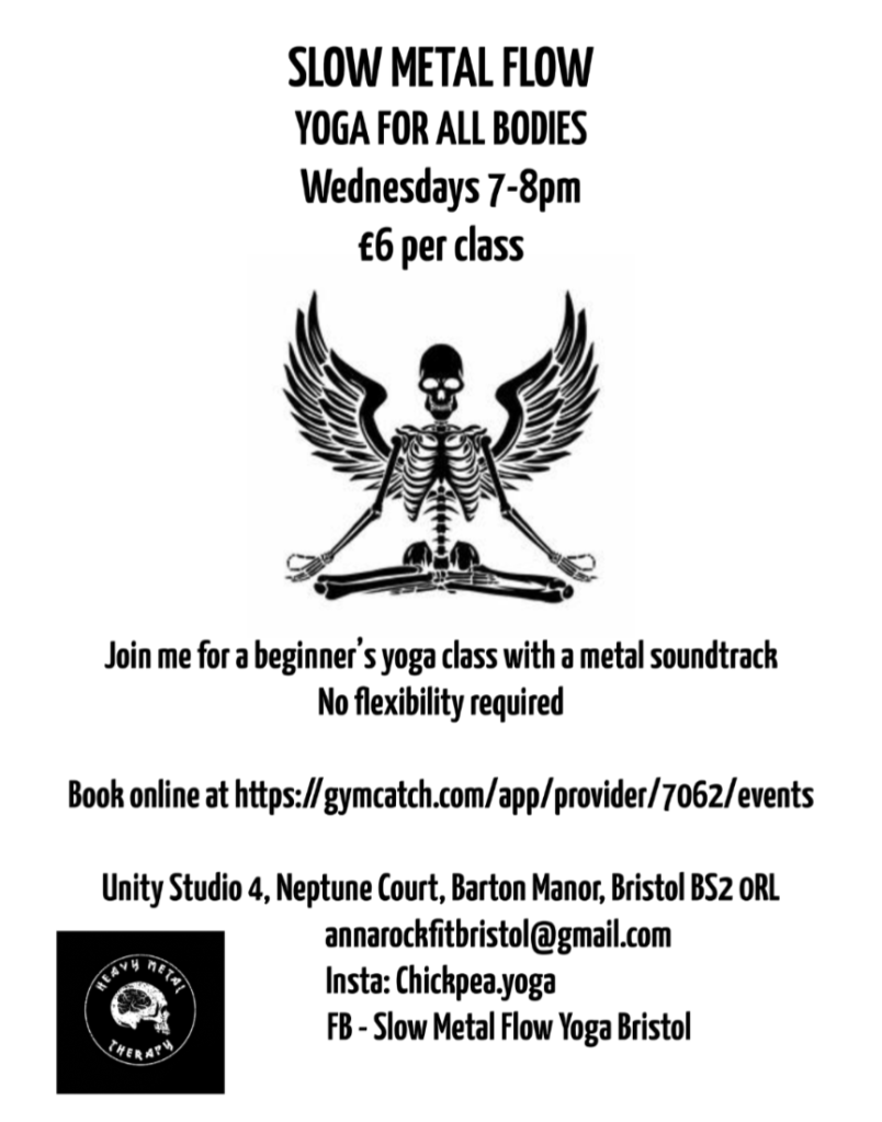 We are really grateful to the fabulous Metal Yoga folks who have started running metal yoga classes in association* with us around the country and online. We have so much interest in this now that we knew it needed a section of it’s own for the site! Anna, host of Slow Metal Flow Yoga in Bristol, shared this blog with us about the experience of attending a metal yoga class:
