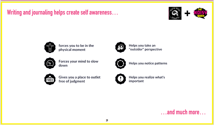 Sometimes, the stuff we write in journals is deeply personal and not for sharing. However, for those that would like to share aspects of their writings, we accept recovery stories and blogs at HMT and The Noisy Brain. The Noisy Brain also accept writings to be used as lyrics, and have an app that can be accessed here. HMT and The Noisy Brain teamed up with Alpha Kinetic to do a metal/industrial song as part of The Noisy Brain project, which you can listen to here: